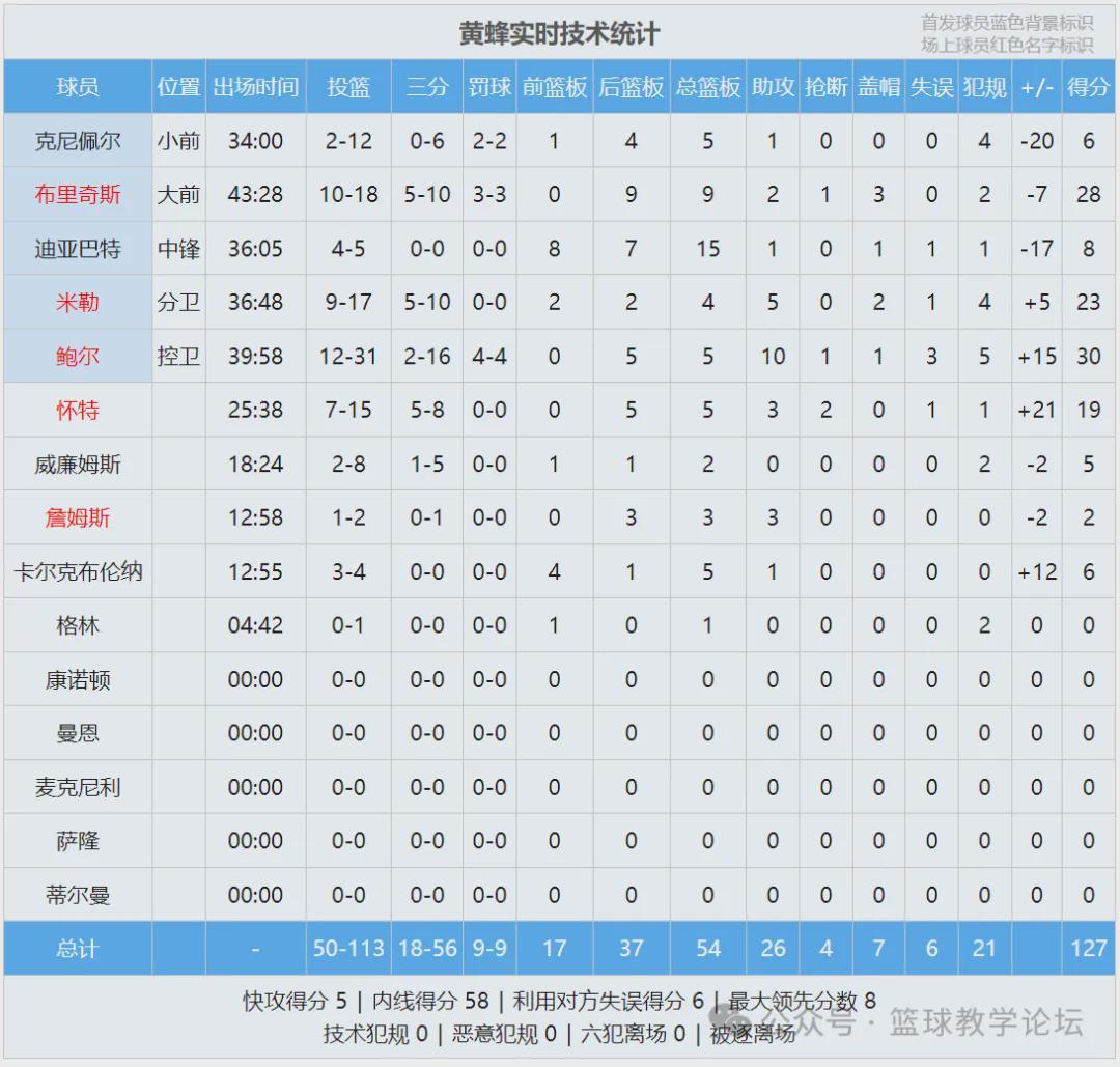 三球砍下30分5板10助、布里奇斯28分9板2助3帽、米勒23分4板6助2帽;小米切尔28分4板6助2断、维金斯27分7板3助、希罗23分3板6助。