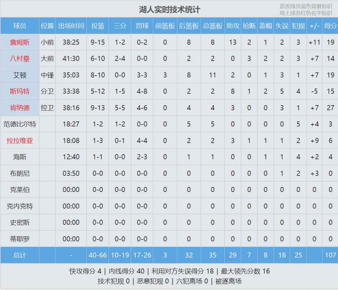 最后2分钟,火箭追到9分。詹姆斯助攻艾顿,后者抛投帮湖人稳住阵脚。最后1分钟,艾顿上篮2+1杀死比赛。全场结束,湖人107-98战胜火箭,取得季后赛开门红!肯纳德27分4板3助、艾顿19分11板2助、詹姆斯19分8板13助2断!
