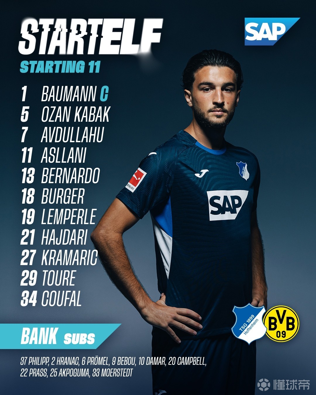 北京时间4月18日21:30,德甲联赛第30轮,多特蒙德客场挑战霍芬海姆,赛前双方首发阵容陆续公布: