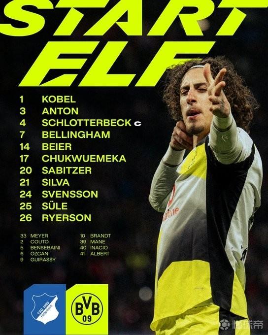 多特蒙德首发:1-科贝尔、3-安东、4-施洛特贝克、7-乔布-贝林厄姆、14-拜尔、17-丘库埃梅卡、20-萨比策、21-法比奥-席尔瓦、24-斯文松、25-聚勒、26-瑞尔森