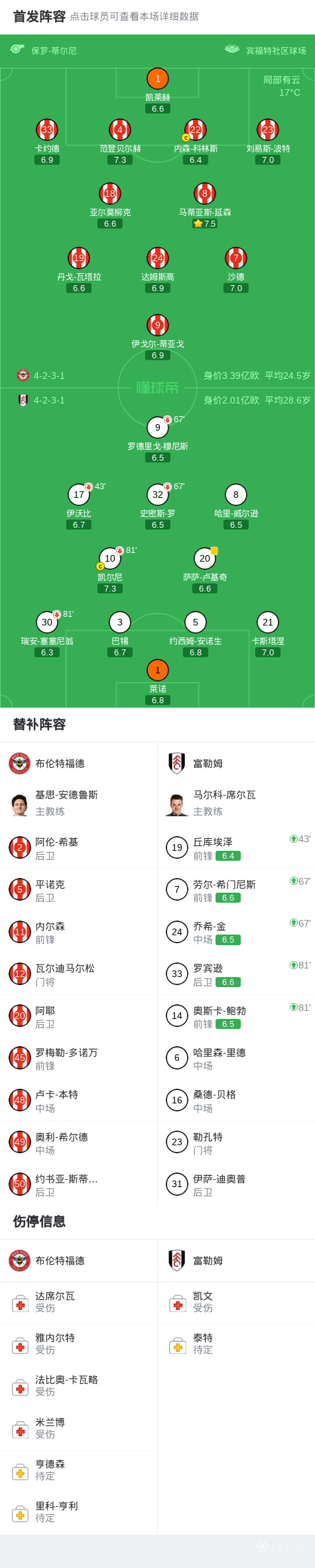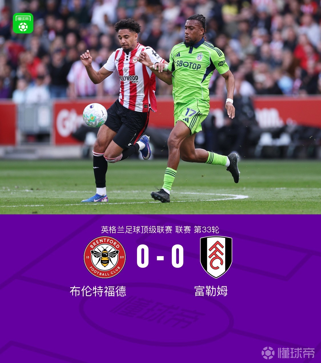北京时间4月18日英格兰足球顶级联赛 联赛 第33轮,布伦特福德主场对阵富勒姆。最终比分布伦特福德 0-0 富勒姆。