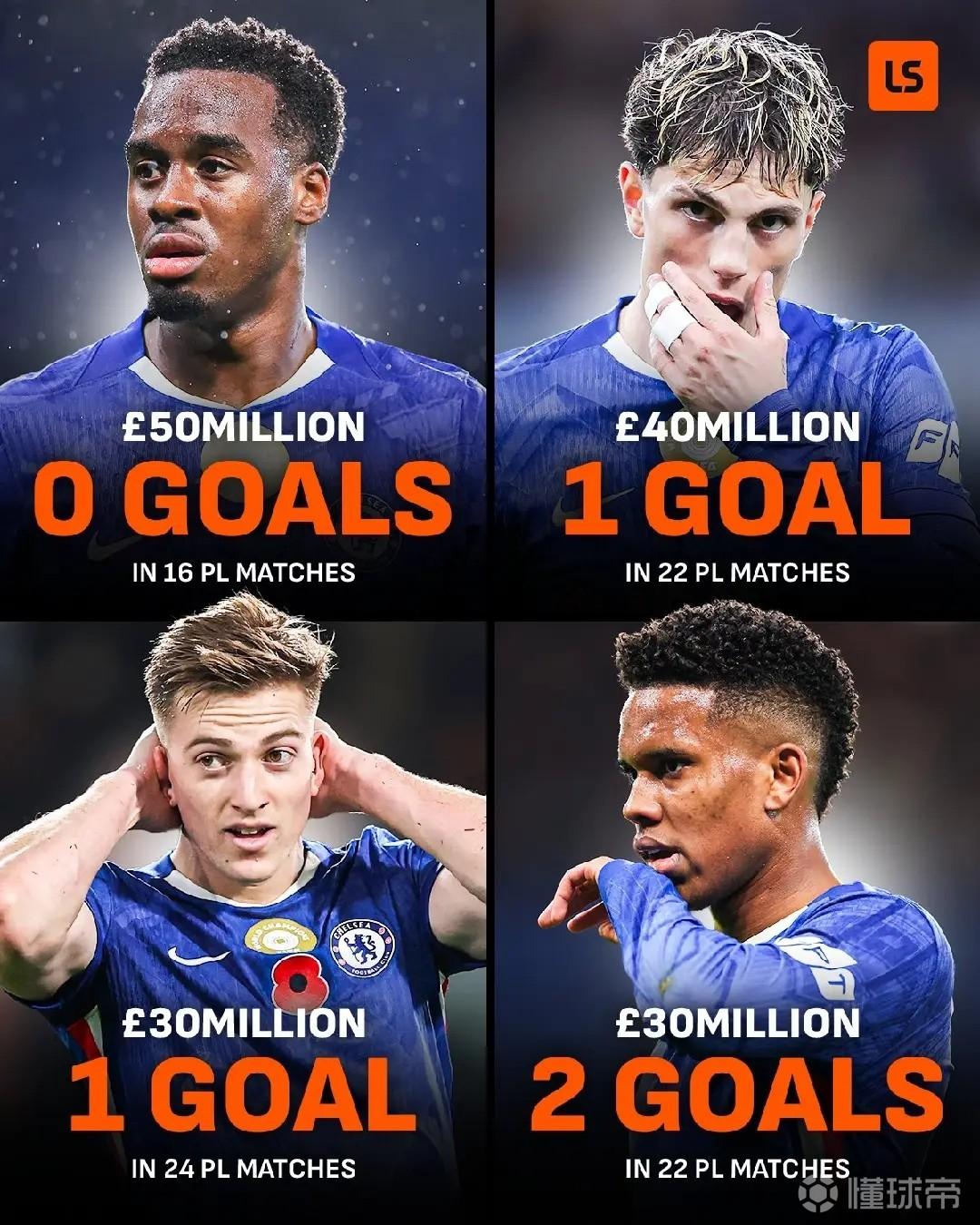据统计,切尔西去年夏窗到队的四名前锋吉滕斯、加纳乔、德拉普和埃斯特旺一共只打入了4粒联赛进球,效率堪忧。