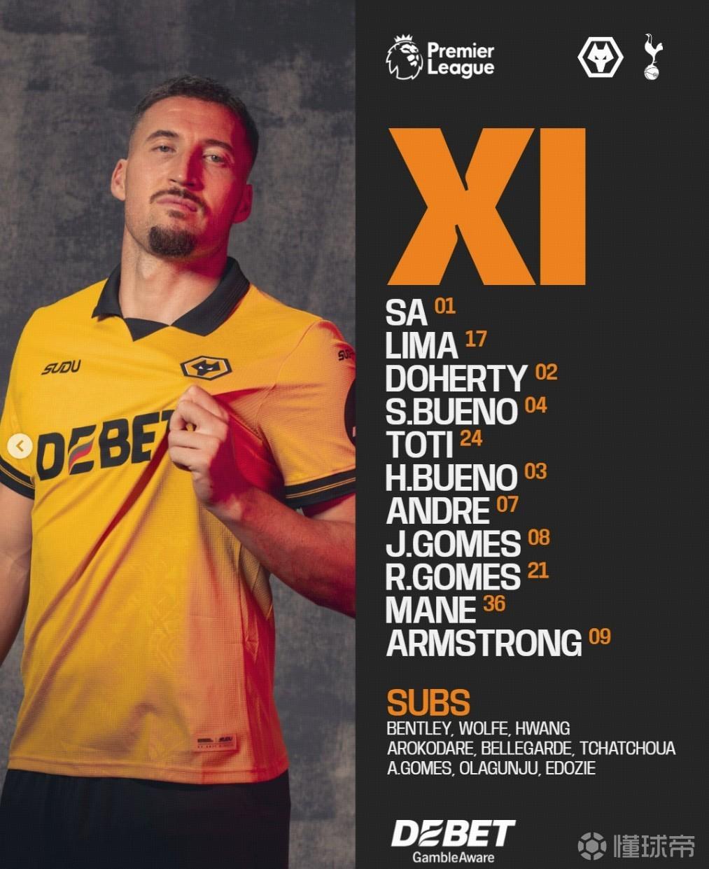 狼队首发:1-若泽-萨、17-佩德罗-利马、2-多尔蒂、4-圣地亚哥-布埃诺、24-托蒂-戈麦斯、3-乌戈-布埃诺、7-安德烈、8-若昂-戈麦斯、21-罗德里戈-戈麦斯、36-马特乌斯-马内、9-亚当-阿姆斯特朗