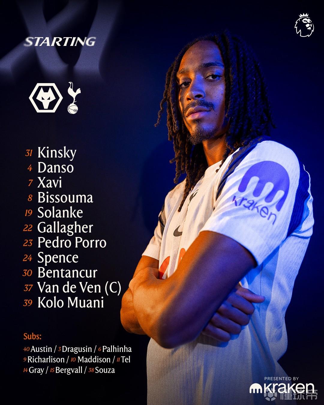 替补:40-布兰登-奥斯汀、3-德拉古辛、6-帕利尼亚、9-里沙利松、10-麦迪逊、11-马蒂斯-特尔、14-阿奇-格雷、15-卢卡斯-贝里瓦尔、38-索萨